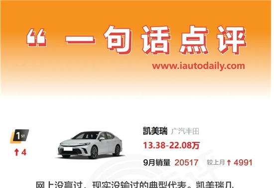 一句话点评9月中型轿车:凯美瑞和Model 3,同领风头10-22 合资反击!15万的帕萨特,12万的天籁、凯美瑞,电车要烂仓库了?24-11 一句话点评7月中型轿车:帕萨特、凯美瑞们,远比想象中能扛24-08 12万的凯美瑞,根本买不到!| 调查24-07 618,车企变相降价“搞事”时24-06 问界M7终端销量暴增15倍,凯美瑞、雅阁暴降24-06 丰田新凯美瑞上市3个月全系官降32000,比影豹便宜24-06 合资B级车的新江湖24-04 丰田新款凯美瑞在美国只提供混动版本星云24-04 试驾第九代凯美瑞,真的不一样了吗?24-04 第9代凯美瑞全面到店上市24-04 2月B级车:帕萨特扩大领先优势,林肯Z进军电混赛道24-03 广汽丰田全新凯美瑞上市 售17.18-20.68万元24-03 17.18万元起,第9代凯美瑞上市24-03 1月B级车:“迈帕”包揽前两名 BBA市场份额超八成10:04 三种风格外观可选 全新凯美瑞3月6日上市24-02